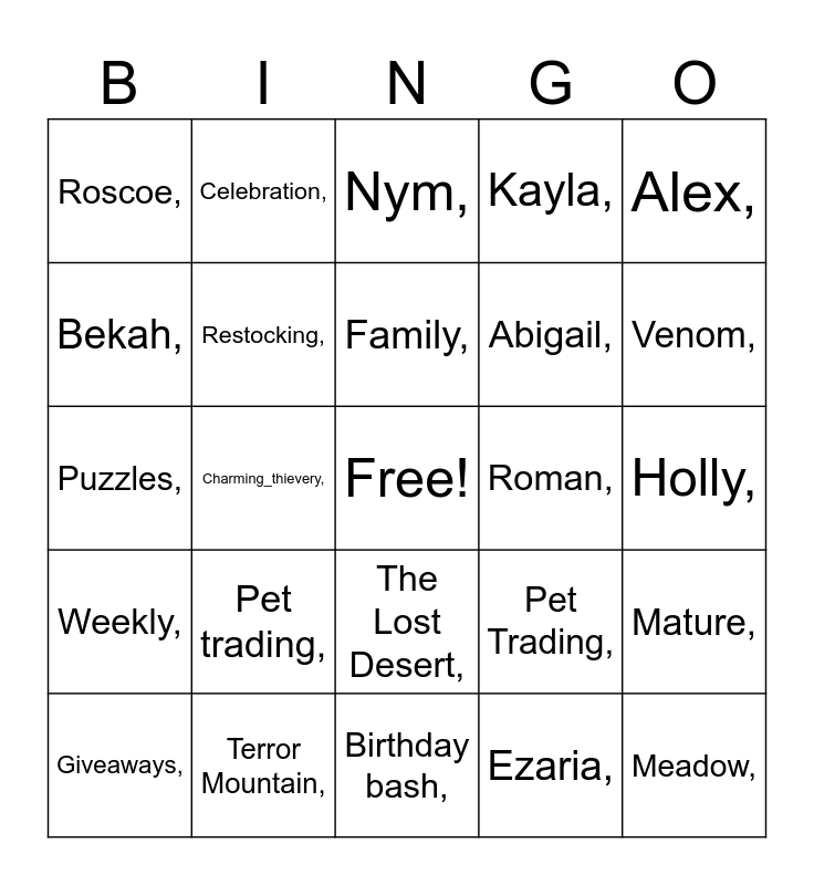 This bingo card has a free space and 92 words: Insomnia,, Birthday,, Birthday bash,, Door prize,, White elephant,, Scavenger hunt,, Swag bag,, Giveaways,, Costume contest,, Mushroom,, Grundos Cafe,, Neopets,, Meker,, Abigail,, Britt,, Alex,, Nym,, Mara,, Council,, Activities,, Weekly Bingo,, Prize Gods,, Monthly,, Food Club,, Pet trading,, Restocking,, The National Neopian Bank,, Faerieland,, Meridell,, The Haunted Woods,, Terror Mountain,, The Lost Desert,, Jelly World,, Maraqua,, Celebration,, Party,, $130 million prizes,, Community,, Family,, Pet Trading,, Puzzles,, Weekly,, Holly,, Rokka,, Meadow,, Zarotrox,, Laura,, Rel,, Tara,, Bry,, Carby,, Prog,, Akira,, Tea,, Yon,, Didi,, Angel,, Bekah,, Bryan,, Charming_thievery,, Cheyanne,, Christina,, Nichole,, Cobra,, Elytra,, Ezaria,, Hillman,, Jam,, Jenn,, Jessica,, Kabber,, Katelyn,, Kayla,, Kendra,, Lucas,, Mads,, Mature,, Pearlwings,, Quill,, Rar,, Reaper,, Roman,, Roscoe,, Sammi,, Sassy,, Kat,, Sparkie,, Tai,, Justin,, Tree,, Venom, and V.