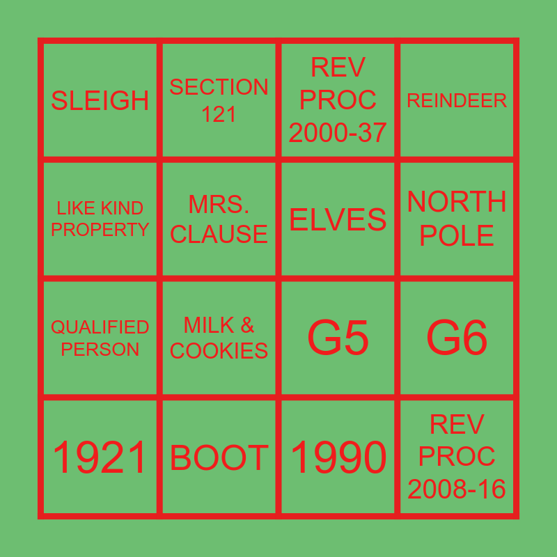 This bingo card has 16 words: BOOT, G6, REV PROC 2000-37, SLEIGH, QUALIFIED PERSON, SECTION 121, G5, 1990, LIKE KIND PROPERTY, MRS. CLAUSE, 1921, REINDEER, MILK & COOKIES, NORTH POLE, ELVES and REV PROC 2008-16.