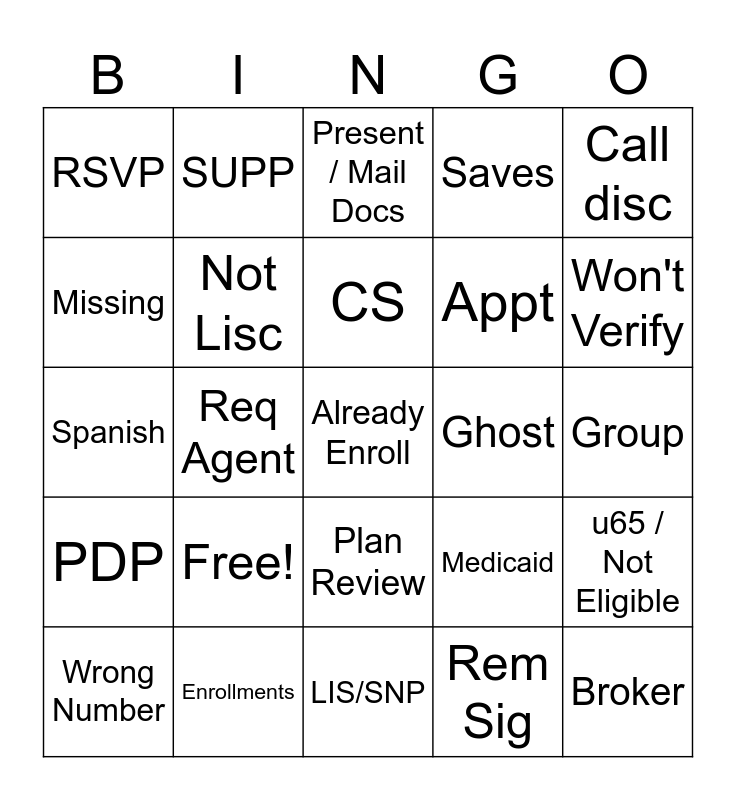 This bingo card has 25 words: Free!, LIS/SNP, CS, Wrong Number, Call disc, RSVP, Missing, SUPP, Ghost, Plan Review, Appt, Spanish, Medicaid, u65 / Not Eligible, Not Lisc, Broker, Group, Present / Mail Docs, Won't Verify, Req Agent, Already Enroll, Enrollments, PDP, Saves and Rem Sig.