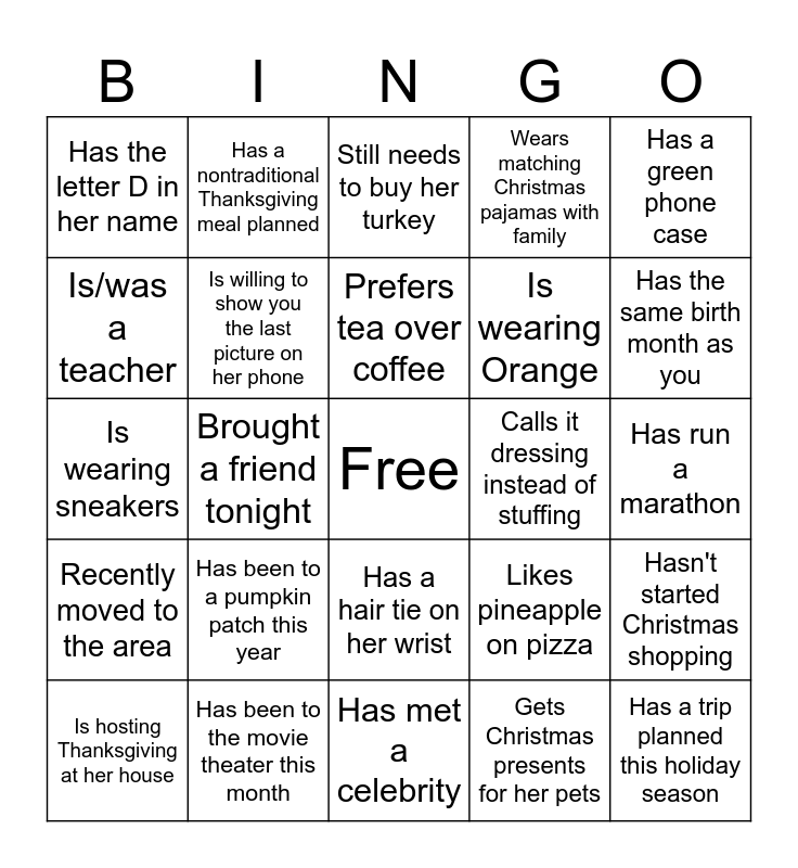 This bingo card has a free space and 39 words: Bought her dish from the store, Is already done Christmas shopping, Brought a friend tonight, Is willing to show you the last picture on her phone, Is hosting Thanksgiving at her house, Has a hair tie on her wrist, Prefers tea over coffee, Forgot her ornament for tonight, Has a green phone case, Recently moved to the area, Brought a friend tonight, Wears matching Christmas pajamas with family, Has a trip planned this holiday season, Has run a marathon, Calls it dressing instead of stuffing, Has been to a pumpkin patch this year, Already has her Christmas tree up, Has the letter D in her name, Works/worked in healthcare, Likes pineapple on pizza, Is/was a teacher, Has met a celebrity, Is wearing Orange, Has the same birth month as you, Has flowers on her outfit, Watches the Macy's Parade every year, Purchased a candle in the past week, Eats dessert first, Watches the same movie every Christmas, Has a nontraditional Thanksgiving meal planned, Can recommend a book she's reading right now, Has holiday themed nails, Still needs to buy her turkey, Has been to the movie theater this month, Gets Christmas presents for her pets, Made her dish from scratch, Hasn't started Christmas shopping, Is wearing sneakers and Can't whistle.