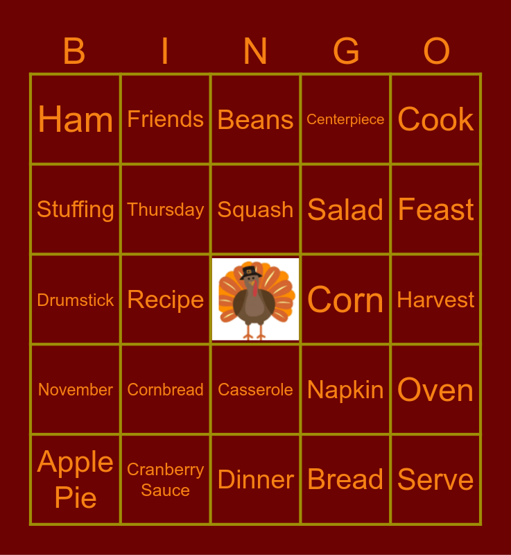 This bingo card has 3 images and 42 words: Apple Pie, Bake, Bread, Beans, Celebrate, Cook, Cranberry Sauce, Centerpiece, Corn, Casserole, Cornbread, Colonists, Dinner, Dessert, Drumstick, Football, Feast, Friends, Grateful, Gravy, Ham, Home, Harvest, Holiday, Leftovers, Napkin, November, Native American, Oven, Pans, Potato, Pumpkin Pie, Recipe, Roast, Rolls, Serve, Squash, Stuffing, Salad, Turkey, Thursday and Yam.
