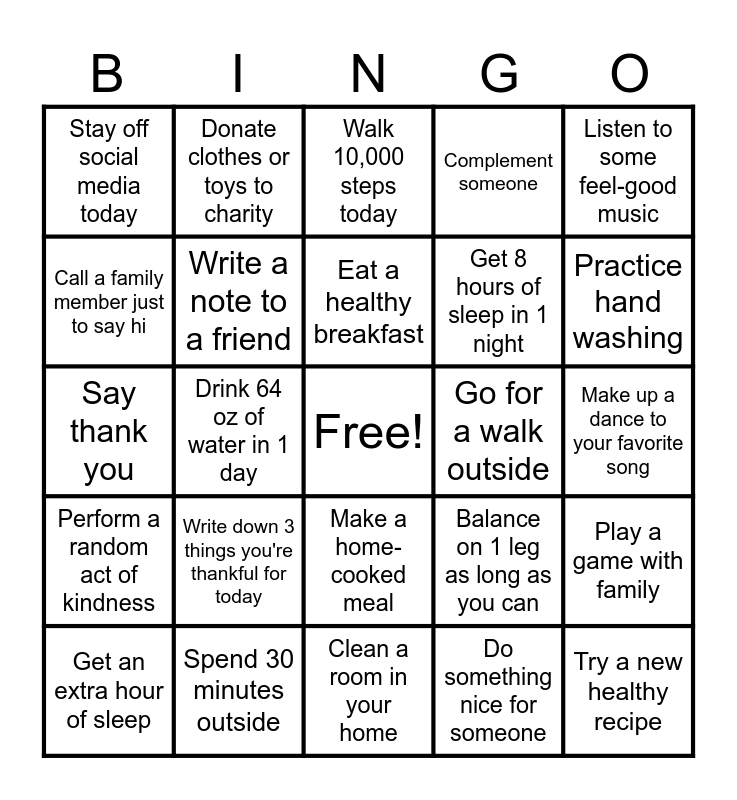 This bingo card has a free space and 24 words: Write down 3 things you're thankful for today, Spend 30 minutes outside, Eat a healthy breakfast, Get an extra hour of sleep, Listen to some feel-good music, Stay off social media today, Call a family member just to say hi, Donate clothes or toys to charity, Go for a walk outside, Make a home-cooked meal, Get 8 hours of sleep in 1 night, Say thank you, Balance on 1 leg as long as you can, Play a game with family, Write a note to a friend, Do something nice for someone, Make up a dance to your favorite song, Walk 10,000 steps today, Practice hand washing, Drink 64 oz of water in 1 day, Try a new healthy recipe, Perform a random act of kindness, Complement someone and Clean a room in your home.