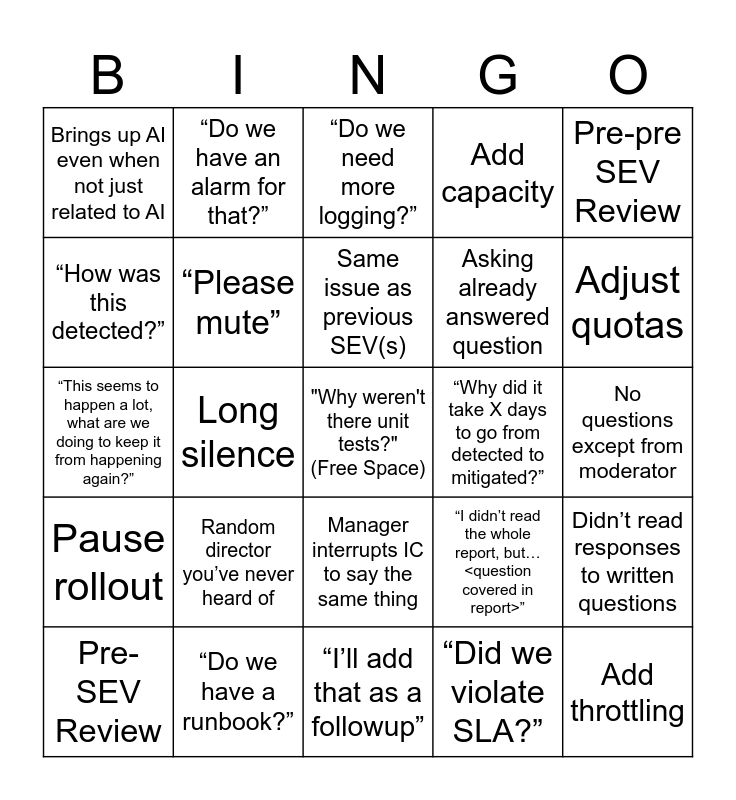 This bingo card has a free space and 24 words: Random director you’ve never heard of, “Do we have a runbook?”, Same issue as previous SEV(s), Pre-SEV Review, Pre-pre SEV Review, Brings up AI even when not just related to AI, “How was this detected?”, “Do we have an alarm for that?”, “Why did it take X days to go from detected to mitigated?”, Manager interrupts IC to say the same thing, Asking already answered question, “This seems to happen a lot, what are we doing to keep it from happening again?”, “I didn’t read the whole report, but… <question covered in report>”, Didn’t read responses to written questions, “Please mute”, “Did we violate SLA?”, No questions except from moderator, “Do we need more logging?”, Adjust quotas, Long silence, Add throttling, Pause rollout, Add capacity and “I’ll add that as a followup”.