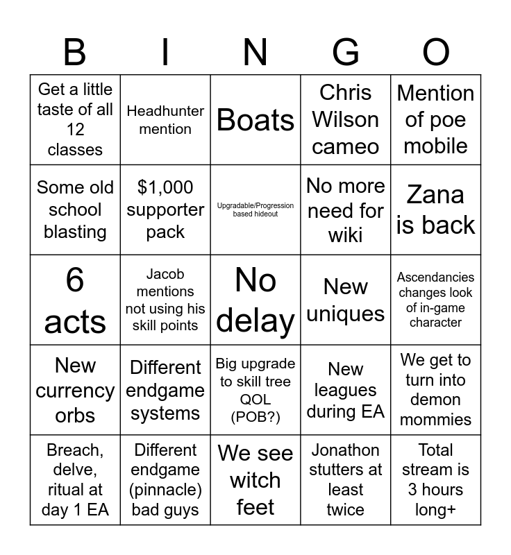 This bingo card has a free space and 24 words: Different endgame systems, Different endgame (pinnacle) bad guys, Upgradable/Progression based hideout, Breach, delve, ritual at day 1 EA, Mention of poe mobile, Get a little taste of all 12 classes, Some old school blasting, Headhunter mention, New uniques, Big upgrade to skill tree QOL (POB?), No more need for wiki, 6 acts, New leagues during EA, We get to turn into demon mommies, $1,000 supporter pack, Jonathon stutters at least twice, Ascendancies changes look of in-game character, Boats, Zana is back, Jacob mentions not using his skill points, Total stream is 3 hours long+, New currency orbs, Chris Wilson cameo and We see witch feet.