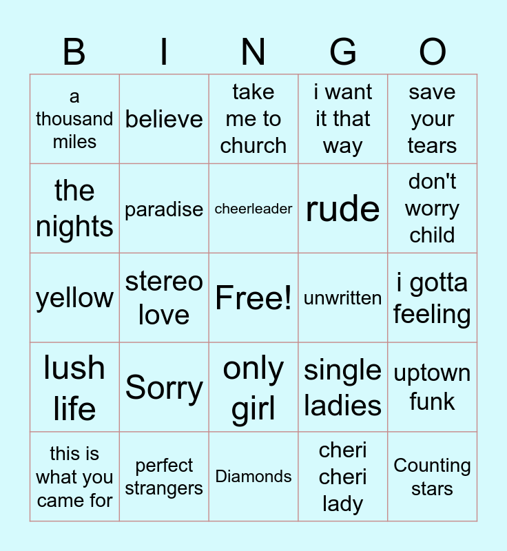 This bingo card has a free space and 49 words: baby, Counting stars, Roar, Diamonds, Sorry, Perfect, believe, fireball, the nights, best song ever, paradise, i want it that way, uptown funk, single ladies, call me maybe, classic, cheerleader, unwritten, too sweet, save your tears, stereo love, cheri cheri lady, a thousand miles, rude, party rock anthem, don't worry child, this is what you came for, domino, only girl, lush life, marry you, get lucky, stronger, ride, perfect strangers, unwritten, crazy in love, iris, i gotta feeling, umbrella, am i wrong, mirrors, Mr.saxobeat, stitches, yellow, take me to church, dancing queen, let me love you and levitating.