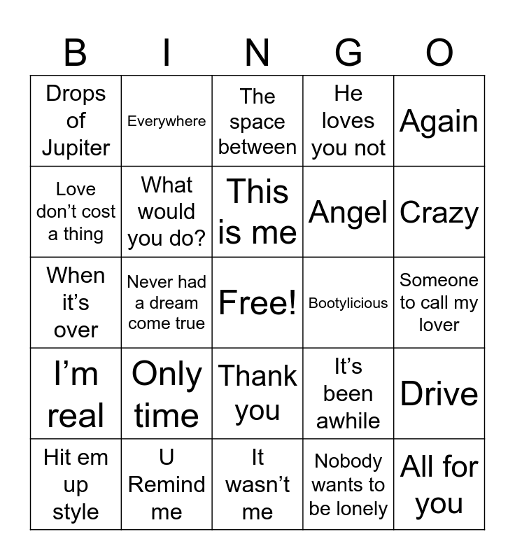 This bingo card has a free space and 54 words: Fallin, I’m real, Family affair, Butterfly, Thank you, Don’t tell me, He loves you not, Gone, Love don’t cost a thing, Hang by Moment, Drops of Jupiter, Jaded, U Remind me, Hit em up style, Survivor, It wasn’t me, All for you, Angel, Turn off the light, Someone to call my lover, It’s been awhile, I’m like a bird, Bootylicious, Again, Let me blow ya mind, Everywhere, Stutter, Irresistible, I hope you dance, Nobody wants to be lonely, Here’s to the night, Beautiful day, Emotion, Superman, The space between, Play, When it’s over, Drive, More than that, What would you do?, Be like that, I wanna be bad, Peaches and cream, Ride wit me, Only time, Where the party at?, Standing steel, Pop, This is me, Never had a dream come true, Crazy, But it feels like for a girl, E.I. and Dig in.