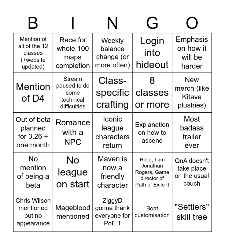 This bingo card has 25 words: No league on start, ZiggyD gonna thank everyone for PoE 1, Class-specific crafting, Chris Wilson mentioned but no appearance, Emphasis on how it will be harder, Mention of all of the 12 classes (+website updated), Mention of D4, Race for whole 100 maps completion, Explanation on how to ascend, Maven is now a friendly character, 8 classes or more, Out of beta planned for 3.26 + one month, Hello, I am Jonathan Rogers, Game director of Path of Exile II, QnA doesn't take place on the usual couch, Stream paused to do some technical difficulties, "Settlers" skill tree, Most badass trailer ever, Weekly balance change (or more often), New merch (like Kitava plushies), Romance with a NPC, Iconic league characters return, Mageblood mentioned, No mention of being a beta, Login into hideout and Boat customisation.