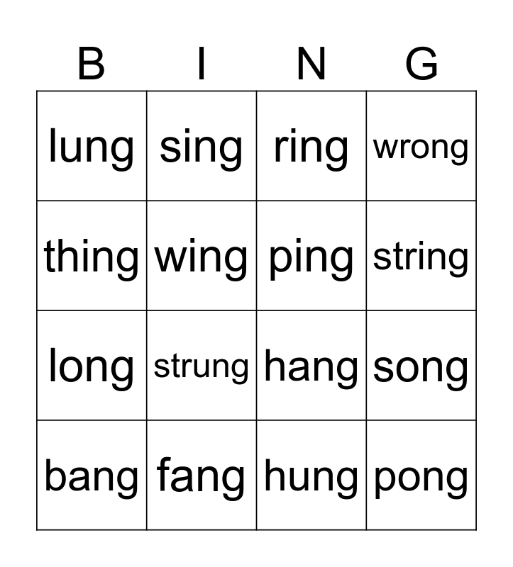 This bingo card has 16 words: fang, song, ring, lung, long, sing, hang, hung, thing, wing, bang, wrong, strung, string, ping and pong.