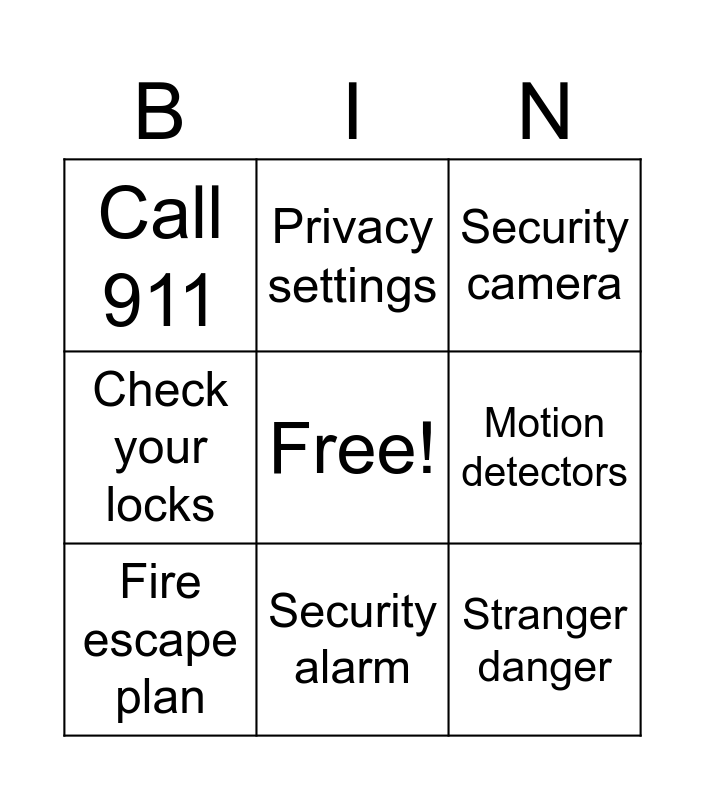 This bingo card has a free space and 19 words: Lock doors and windows, Home security system, Security camera, Deadbolt locks, Emergency contacts, Stranger danger, Don’t share location, Call 911, Privacy settings, Keep lights on at night, Screen visitors, Motion detectors, Fire escape plan, Don’t leave keys outside, Door/window alarms, Clutter-free exits, Check your locks, Security alarm and Install a doorbell camera.