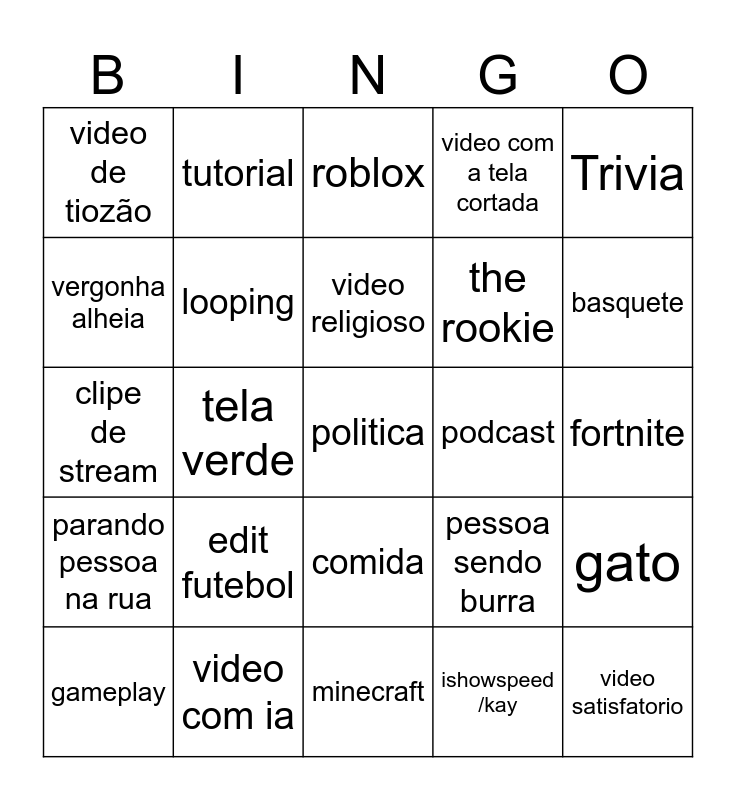 This bingo card has a free space and 24 words: edit futebol, video com ia, video religioso, gameplay, Trivia, video de tiozão, vergonha alheia, tutorial, podcast, comida, the rookie, clipe de stream, pessoa sendo burra, gato, looping, ishowspeed /kay, fortnite, roblox, basquete, tela verde, video satisfatorio, parando pessoa na rua, video com a tela cortada and minecraft.