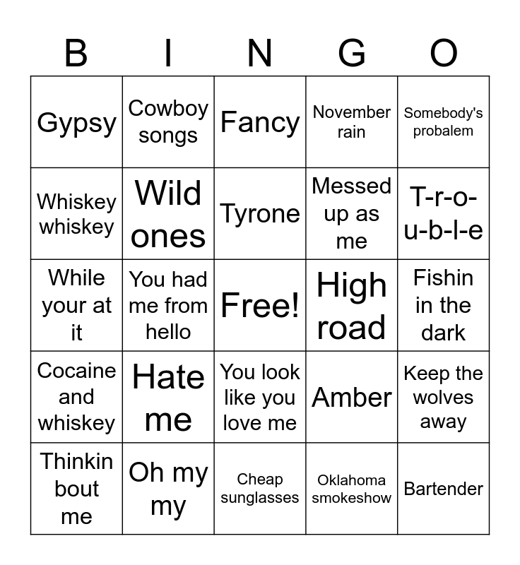 This bingo card has a free space and 24 words: Hate me, Oh my my, Tyrone, Thinkin bout me, Somebody's probalem, Gypsy, Whiskey whiskey, Cowboy songs, High road, You look like you love me, Messed up as me, While your at it, Amber, Keep the wolves away, Wild ones, Oklahoma smokeshow, Fishin in the dark, Fancy, T-r-o-u-b-l-e, You had me from hello, Bartender, Cocaine and whiskey, November rain and Cheap sunglasses.