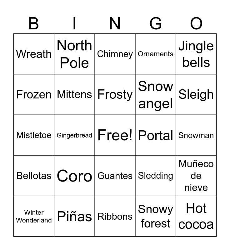 This bingo card has a free space and 75 words: Candy cane, Carrot nose, Chimney, Christmas cake, Christmas Eve, Christmas lights, Christmas stocking, Christmas tree, Cozy blanket, Eggnog, Elf, Fireplace, Frosty, Frozen, Gift wrapping, Gingerbread, Holiday, Hot cocoa, Ice skating, Jingle bells, Marshmallows, Mistletoe, Mittens, North Pole, Ornaments, Penguins, Polar bear, Present, Reindeer, Rudolf, Santa's hat, Santa’s workshop, Scarf, Sledding, Sleigh, Snow angel, Snowball fight, Snowflake, Snowman, Snowy forest, Star, The Grinch, The Northern Lights, Ugly sweater, Winter boots, Winter storm, Winter Wonderland, Wreath, Bufanda, Queque navideño, Rompope, Guantes, Abrigo, Velas, Candelas, Corona de adviento, Faroles, Desfiles, Parades, Conciertos, Coro, Choir, Villancicos, Carols, Posadas, Portal, Pesebre, Nativity scene, Reno, Muñeco de nieve, Bellotas, Piñas, Pinecones, Ribbons and Luces navideñas.