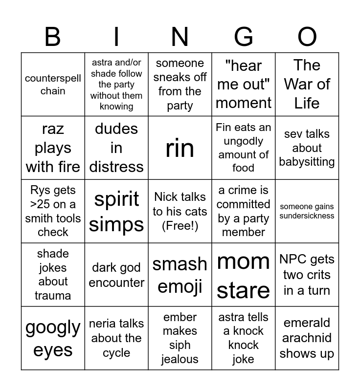 This bingo card has a free space and 29 words: googly eyes, someone dies, spirit simps, failed wisdom save, counterspell chain, someone sneaks off from the party, dudes in distress, dark god encounter, a crime is committed by a party member, neria talks about the cycle, someone gains sundersickness, emerald arachnid shows up, ember makes siph jealous, astra tells a knock knock joke, sev talks about babysitting, the room was dark (fade to black), smash emoji, shade jokes about trauma, The War of Life, Rys gets >25 on a smith tools check, mom stare, Aros is a therapist, Fin eats an ungodly amount of food, raz plays with fire, "hear me out" moment, astra and/or shade follow the party without them knowing, NPC gets two crits in a turn, rin and 20+ min off-topic rant.