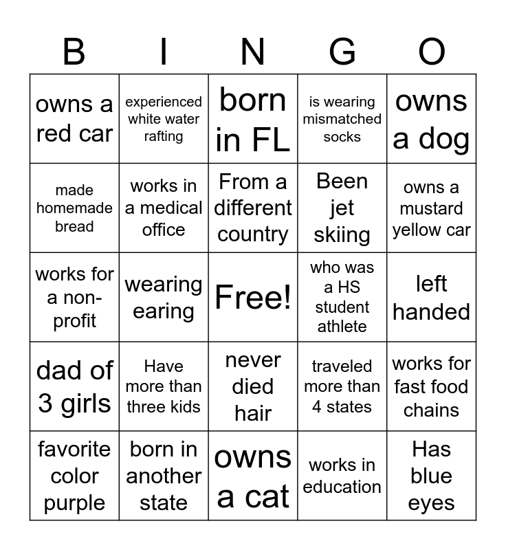 This bingo card has a free space and 24 words: favorite color purple, Have more than three kids, From a different country, works in education, owns a dog, owns a red car, experienced white water rafting, born in FL, who was a HS student athlete, left handed, works for a non-profit, works in a medical office, traveled more than 4 states, works for fast food chains, made homemade bread, born in another state, owns a cat, is wearing mismatched socks, owns a mustard yellow car, dad of 3 girls, wearing earing, never died hair, Been jet skiing and Has blue eyes.