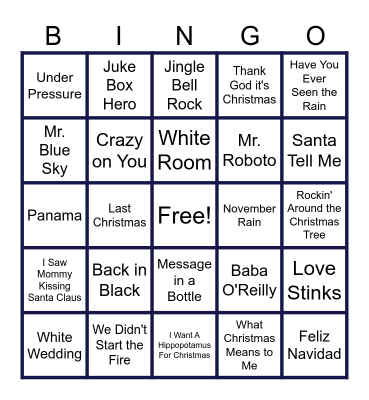 This bingo card has a free space and 24 words: Back in Black, We Didn't Start the Fire, White Room, White Wedding, Have You Ever Seen the Rain, Under Pressure, Mr. Blue Sky, Juke Box Hero, November Rain, Message in a Bottle, Mr. Roboto, Panama, Baba O'Reilly, Love Stinks, Crazy on You, What Christmas Means to Me, Rockin' Around the Christmas Tree, Jingle Bell Rock, Santa Tell Me, Last Christmas, Feliz Navidad, I Saw Mommy Kissing Santa Claus, Thank God it's Christmas and I Want A Hippopotamus For Christmas.