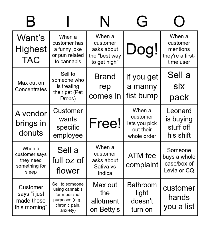 This bingo card has a free space and 49 words: customer leaves something behind, customer hands you a list, When you make small talk with someone who only wants to buy one thing, Max out the allotment on Betty’s, Sell a full oz of flower, Ciara mentions she needs a C4, When a customer has a funny joke or pun related to cannabis, You sell a bong, Max out on Concentrates, Oh you guys sell ice cream?!, Sell to someone who is treating their pet (Pet Drops), Dog!, Someone buys a whole case/box of Levia or CQ, ATM fee complaint, Sell a CBD product, Sell to someone celebrating their birthday, Brand rep comes in, When a customer lets you pick out their whole order, Sell a 2g vape pen, When a customer mentions they're a first-time user, Customer wants specific employee, Bathroom light doesn’t turn on, Want’s Highest TAC, If you get a manny fist bump, When a customer asks about deals/discounts, Sell a six pack, Customer says “i just made those this morning”, Sell 2 add ons, When a customer asks about Sativa vs Indica, When a customer says they need something for sleep, Sell 4 ice cream and a scoop, The hidden hemlock guys come in, When a customer does a "happy dance" in the store, What do you mean it's sold out?, Sell to someone using cannabis for medicinal purposes (e.g., chronic pain, anxiety), Someone asks what TAC is, When someone rings the doorbell, Preorder customer at Flower wall, Leonard is buying stuff off his shift, Someone asks for any pre roll or flower with the highest TAC, Sell 3.5g Concentrate, Sell a glass cup, When a customer asks about CBD only products, Doesn’t scan, Means it’s free right?, A vendor brings in donuts, When a customer asks about the "best way to get high", Sell 2 silver stickers in one go, Customer tries to use a credit card and When a customer mentions they've been coming to your store for years.