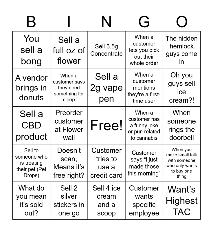 This bingo card has a free space and 49 words: Max out on Concentrates, Want’s Highest TAC, Sell a six pack, Sell 4 ice cream and a scoop, Doesn’t scan, Means it’s free right?, Sell to someone celebrating their birthday, Sell a full oz of flower, Bathroom light doesn’t turn on, A vendor brings in donuts, Ciara mentions she needs a C4, When a customer says they need something for sleep, When a customer lets you pick out their whole order, When you make small talk with someone who only wants to buy one thing, Customer says “i just made those this morning”, When a customer asks about the "best way to get high", customer hands you a list, Sell a 2g vape pen, When a customer has a funny joke or pun related to cannabis, Someone asks what TAC is, The hidden hemlock guys come in, Preorder customer at Flower wall, Customer wants specific employee, You sell a bong, When a customer mentions they're a first-time user, Someone buys a whole case/box of Levia or CQ, Oh you guys sell ice cream?!, What do you mean it's sold out?, customer leaves something behind, Customer tries to use a credit card, Sell to someone who is treating their pet (Pet Drops), When a customer does a "happy dance" in the store, Dog!, ATM fee complaint, When a customer asks about deals/discounts, Sell 2 silver stickers in one go, Sell 2 add ons, When a customer asks about CBD only products, Brand rep comes in, When someone rings the doorbell, When a customer mentions they've been coming to your store for years, Leonard is buying stuff off his shift, When a customer asks about Sativa vs Indica, Sell to someone using cannabis for medicinal purposes (e.g., chronic pain, anxiety), Sell a glass cup, Sell a CBD product, Sell 3.5g Concentrate, Someone asks for any pre roll or flower with the highest TAC, If you get a manny fist bump and Max out the allotment on Betty’s.
