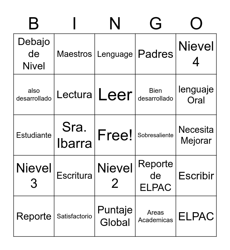 This bingo card has a free space and 29 words: Reporte, Calificaciones, Sra. Ibarra, Arriva de Nivel, Debajo de Nivel, Lenguage, Lectura, Escritura, Sobresaliente, Satisfactorio, Necesita Mejorar, ELPAC, Puntaje Global, Areas Academicas, lenguaje Oral, Nivel 1, Nievel 2, Nievel 3, Nievel 4, Estudiante, Reporte de ELPAC, Evaluación Sumativa ELPAC, Bien desarrollado, also desarrollado, Padres, Maestros, Escribir, Leer and Hablar.