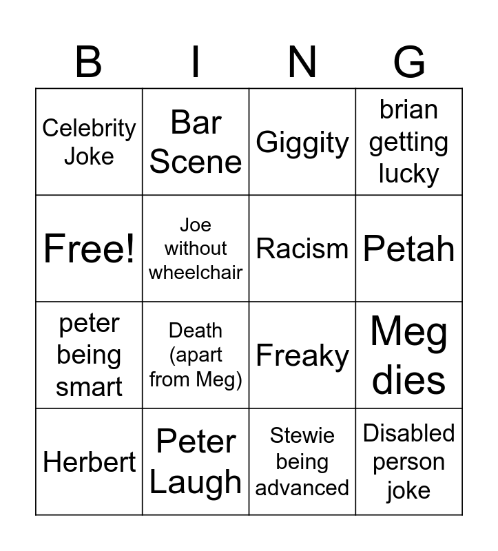 This bingo card has 16 words: Peter Laugh, Meg dies, Giggity, Celebrity Joke, peter being smart, Bar Scene, Freaky, Stewie being advanced, Free!, Joe without wheelchair, Herbert, brian getting lucky, Death (apart from Meg), Petah, Racism and Disabled person joke.