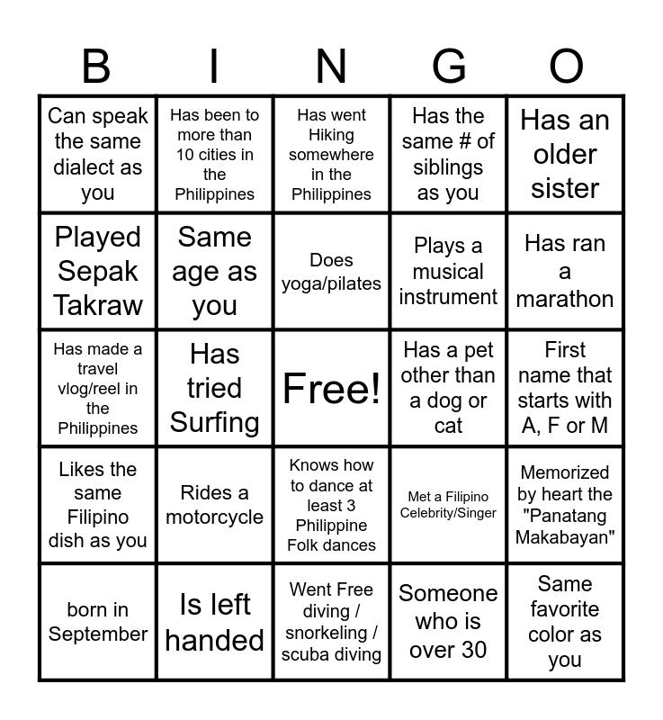 This bingo card has a free space and 24 words: Rides a motorcycle, Is left handed, Does yoga/pilates, born in September, Has an older sister, Can speak the same dialect as you, Played Sepak Takraw, Has been to more than 10 cities in the Philippines, Has a pet other than a dog or cat, Knows how to dance at least 3 Philippine Folk dances, Plays a musical instrument, Has made a travel vlog/reel in the Philippines, Met a Filipino Celebrity/Singer, Memorized by heart the "Panatang Makabayan", Same age as you, Someone who is over 30, First name that starts with A, F or M, Has went Hiking somewhere in the Philippines, Has ran a marathon, Has tried Surfing, Same favorite color as you, Likes the same Filipino dish as you, Has the same # of siblings as you and Went Free diving / snorkeling / scuba diving.