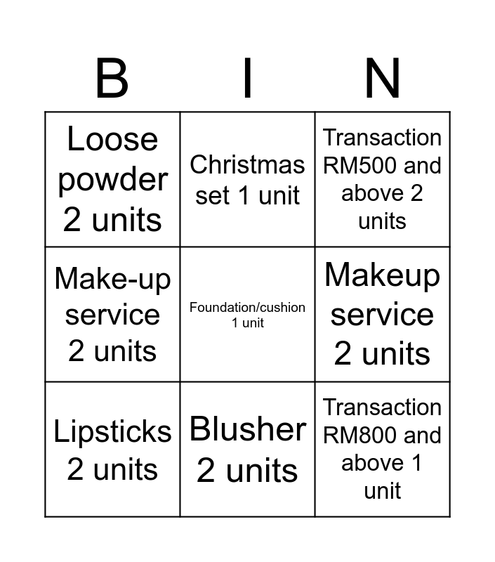 This bingo card has 14 words: Cross sales 1 unit, Mascara 2 units, Lipsticks 2 units, Christmas set 1 unit, Make-up service 2 units, Foundation/cushion 1 unit, Transaction RM800 and above 1 unit, A day transaction above RM2,500, Blusher 2 units, Loose powder 2 units, Cross sales 1 unit, Makeup service 2 units, Transaction RM500 and above 2 units and Loose Powder 2 units.