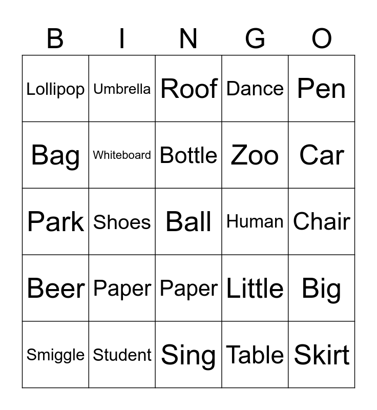 This bingo card has a free space and 24 words: Paper, Student, Bottle, Smiggle, Pen, Lollipop, Bag, Umbrella, Human, Paper, Zoo, Park, Little, Big, Whiteboard, Table, Chair, Roof, Car, Shoes, Skirt, Beer, Dance and Sing.