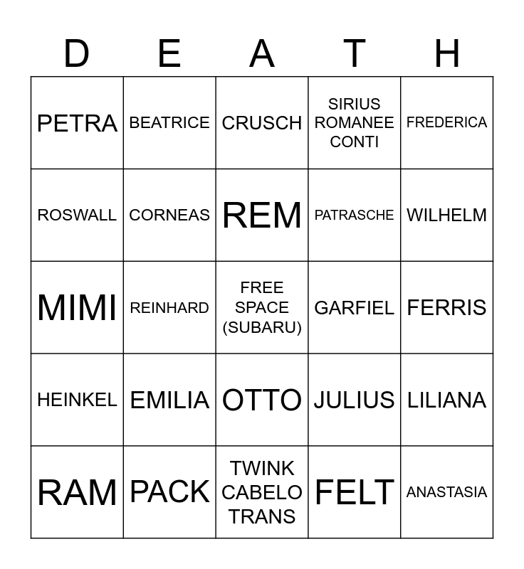 This bingo card has a free space and 24 words: EMILIA, PACK, REM, RAM, FREDERICA, PETRA, ROSWALL, BEATRICE, GARFIEL, OTTO, PATRASCHE, MIMI, JULIUS, LILIANA, CORNEAS, FELT, FERRIS, CRUSCH, WILHELM, REINHARD, ANASTASIA, HEINKEL, SIRIUS ROMANEE CONTI and TWINK CABELO TRANS.