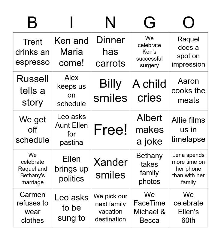 This bingo card has a free space and 24 words: Ellen brings up politics, Leo asks to be sung to, Billy smiles, Carmen refuses to wear clothes, Raquel does a spot on impression, Trent drinks an espresso, Russell tells a story, Ken and Maria come!, Albert makes a joke, Xander smiles, A child cries, We get off schedule, Bethany takes family photos, Lena spends more time on her phone than with her family, Alex keeps us on schedule, We FaceTime Michael & Becca, Allie films us in timelapse, Dinner has carrots, Aaron cooks the meats, Leo asks Aunt Ellen for pastina, We celebrate Ellen's 60th, We celebrate Raquel and Bethany's marriage, We celebrate Ken's successful surgery and We pick our next family vacation destination.