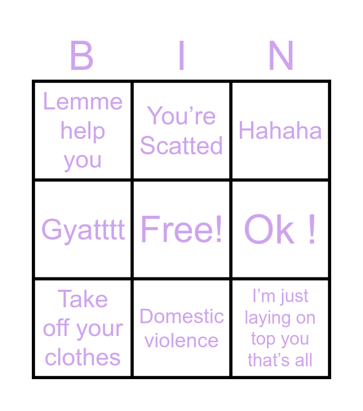 This bingo card has a free space and 8 words: Ok !, Hahaha, You’re Scatted, Take off your clothes, Lemme help you, I’m just laying on top you that’s all, Gyatttt and Domestic violence.