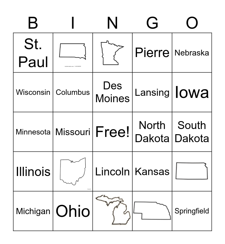 This bingo card has 6 images, a free space and 18 words: Ohio, Des Moines, Michigan, Nebraska, St. Paul, Wisconsin, North Dakota, Lincoln, Lansing, Minnesota, Kansas, Columbus, South Dakota, Iowa, Missouri, Springfield, Illinois and Pierre.