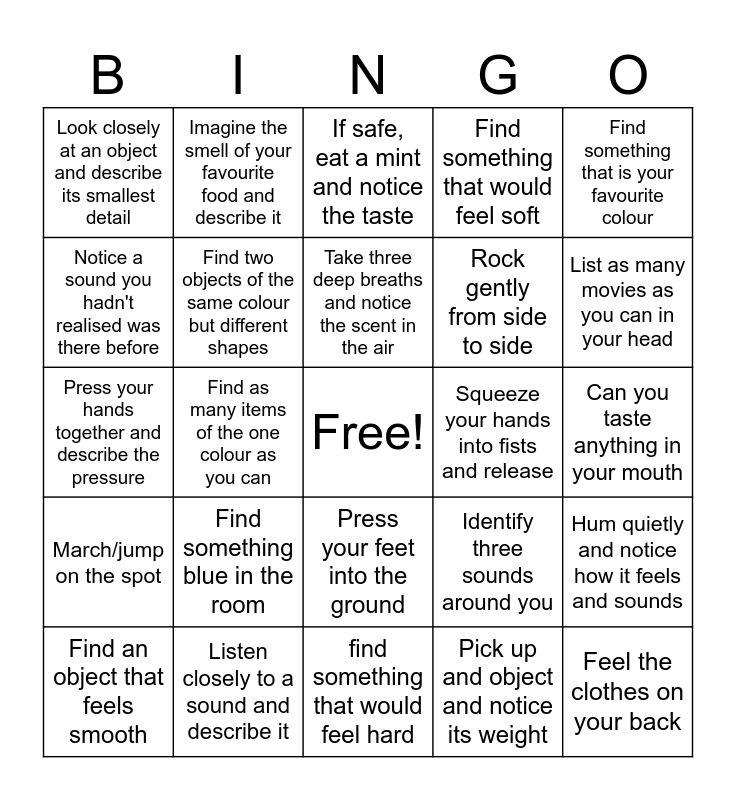 This bingo card has a free space and 24 words: Find something blue in the room, Listen closely to a sound and describe it, Take three deep breaths and notice the scent in the air, Find an object that feels smooth, Find something that is your favourite colour, Look closely at an object and describe its smallest detail, Notice a sound you hadn't realised was there before, Imagine the smell of your favourite food and describe it, Squeeze your hands into fists and release, Press your feet into the ground, Rock gently from side to side, Press your hands together and describe the pressure, Identify three sounds around you, Hum quietly and notice how it feels and sounds, Find two objects of the same colour but different shapes, Pick up and object and notice its weight, Can you taste anything in your mouth, If safe, eat a mint and notice the taste, List as many movies as you can in your head, Find as many items of the one colour as you can, Feel the clothes on your back, March/jump on the spot, Find something that would feel soft and find something that would feel hard.