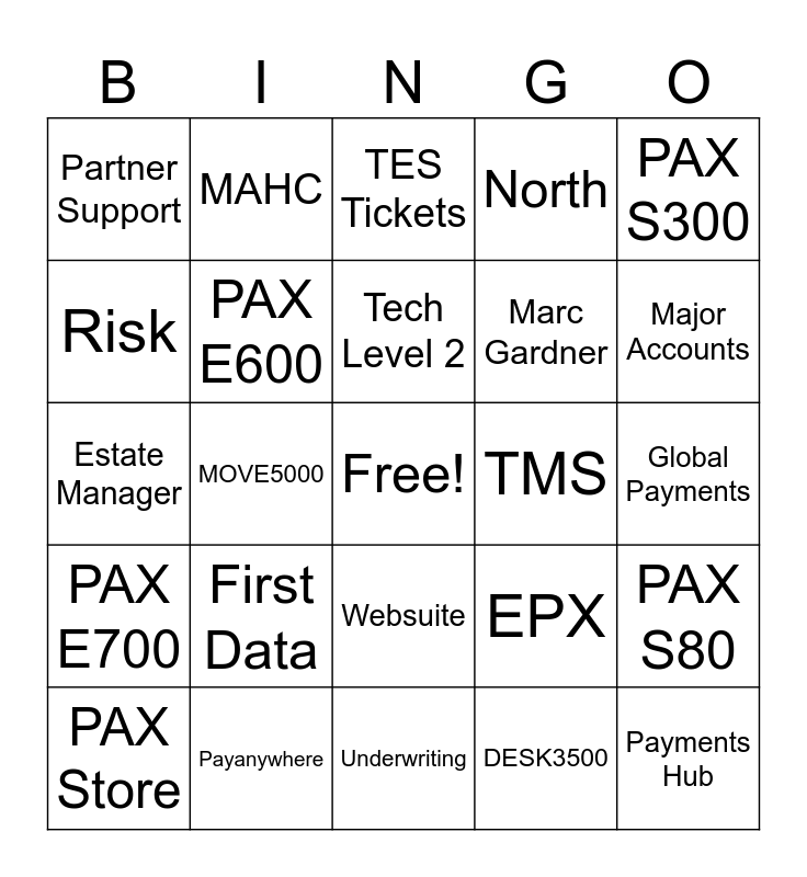 This bingo card has a free space and 32 words: DESK3500, LANE3000, MOVE5000, PAX A920, PAX E700, PAX E600, PAX S300, PAX S80, MAHC, Task Us, Tech Level 2, TES Tickets, Troubleshooting, Verification, TMS, Web Status, PAX Store, Estate Manager, Websuite, First Data, EPX, TSYS, Global Payments, Payanywhere, Payments Hub, North, Marc Gardner, Risk, Partner Support, Underwriting, Customer Service and Major Accounts.