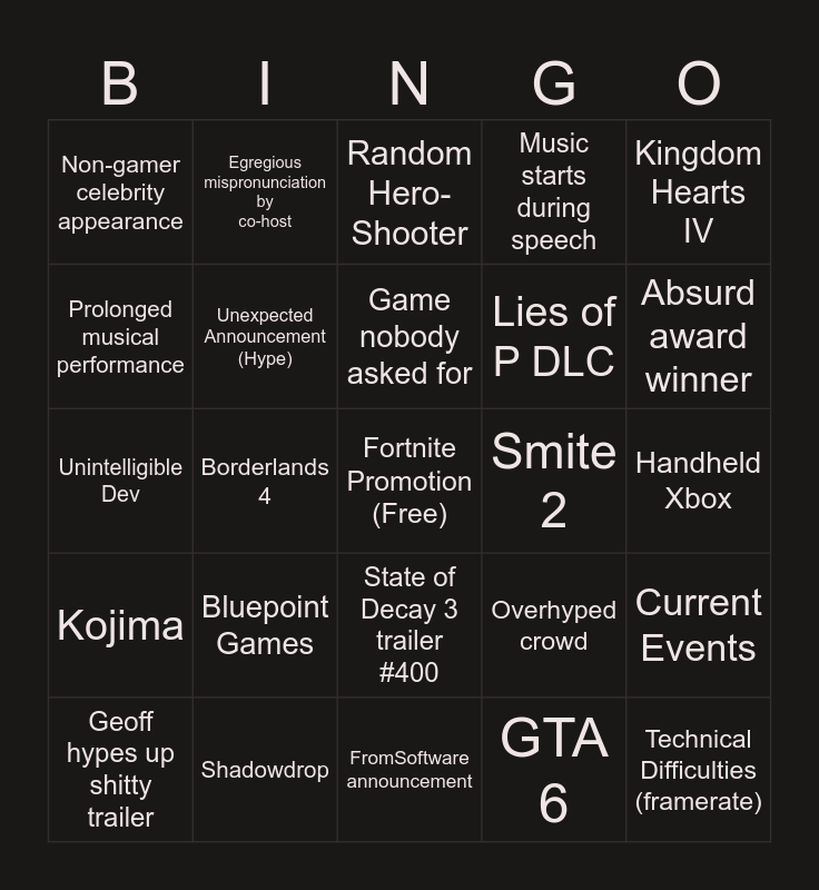 This bingo card has a free space and 24 words: Bluepoint Games, Shadowdrop, Game nobody asked for, Geoff hypes up shitty trailer, Kingdom Hearts IV, Non-gamer celebrity appearance, Prolonged musical performance, Egregious mispronunciation by co-host, Smite 2, State of Decay 3 trailer #400, Lies of P DLC, Unintelligible Dev, Overhyped crowd, Current Events, Unexpected Announcement (Hype), GTA 6, Handheld Xbox, Random Hero-Shooter, Absurd award winner, Borderlands 4, Technical Difficulties (framerate), Kojima, Music starts during speech and FromSoftware announcement.