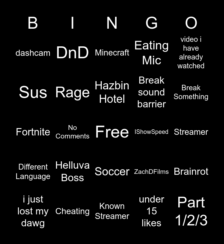 This bingo card has a free space and 24 words: i just lost my dawg, Helluva Boss, Hazbin Hotel, under 15 likes, video i have already watched, dashcam, DnD, Minecraft, IShowSpeed, Streamer, Fortnite, Rage, ZachDFilms, Brainrot, Sus, Cheating, Known Streamer, Eating Mic, Break Something, Different Language, No Comments, Soccer, Break sound barrier and Part 1/2/3.