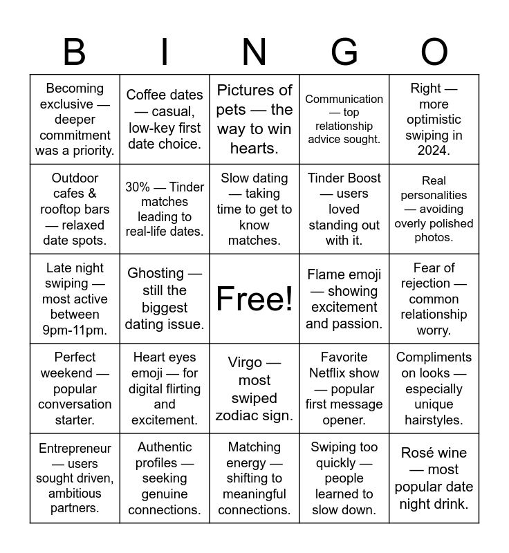 This bingo card has a free space and 25 words: Heart eyes emoji — for digital flirting and excitement., Matching energy — shifting to meaningful connections., Slow dating — taking time to get to know matches., Entrepreneur — users sought driven, ambitious partners., Right — more optimistic swiping in 2024., Becoming exclusive — deeper commitment was a priority., Outdoor cafes & rooftop bars — relaxed date spots., Coffee dates — casual, low-key first date choice., Flame emoji — showing excitement and passion., Virgo — most swiped zodiac sign., Tinder Boost — users loved standing out with it., Late night swiping — most active between 9pm-11pm., Favorite Netflix show — popular first message opener., Compliments on looks — especially unique hairstyles., 30% — Tinder matches leading to real-life dates., Be authentic — honesty and vulnerability were key., Fear of rejection — common relationship worry., Pictures of pets — the way to win hearts., Real personalities — avoiding overly polished photos., Ghosting — still the biggest dating issue., Rosé wine — most popular date night drink., Authentic profiles — seeking genuine connections., Perfect weekend — popular conversation starter., Communication — top relationship advice sought. and Swiping too quickly — people learned to slow down..