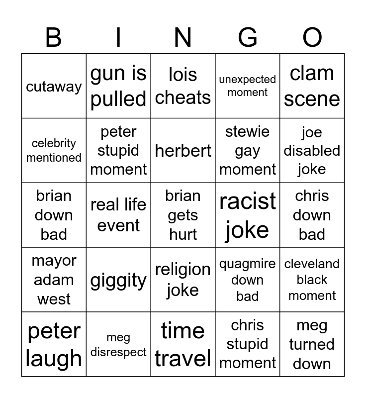 This bingo card has a free space and 24 words: giggity, meg disrespect, herbert, peter laugh, clam scene, cutaway, celebrity mentioned, gun is pulled, racist joke, religion joke, stewie gay moment, brian down bad, quagmire down bad, cleveland black moment, peter stupid moment, chris stupid moment, chris down bad, lois cheats, joe disabled joke, real life event, meg turned down, mayor adam west, unexpected moment and time travel.