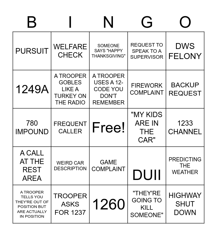 This bingo card has a free space and 31 words: 1260, DOMESTIC, FREQUENT CALLER, ELUDE, PURSUIT, SOMEONE SAYS "HAPPY THANKSGIVING", A TROOPER GOBLES LIKE A TURKEY ON THE RADIO, DUII, "MY KIDS ARE IN THE CAR", "THEY'RE GOING TO KILL SOMEONE", 1233 CHANNEL, HIGHWAY SHUT DOWN, 1216, ATL, BACKUP REQUEST, TREE DOWN, PREDICTING THE WEATHER, WEIRD CAR DESCRIPTION, A CALL AT THE REST AREA, GAME COMPLAINT, DWS FELONY, "GIVE IT TO COUNTY", A TROOPER TELLS YOU THEY'RE OUT OF POSITION BUT ARE ACTUALLY IN POSITION, WELFARE CHECK, FIREWORK COMPLAINT, 1249A, REQUEST TO SPEAK TO A SUPERVISOR, 780 IMPOUND, TROOPER ASKS FOR 1237, A TROOPER USES A 12-CODE YOU DON'T REMEMBER and 1218 REQUEST.