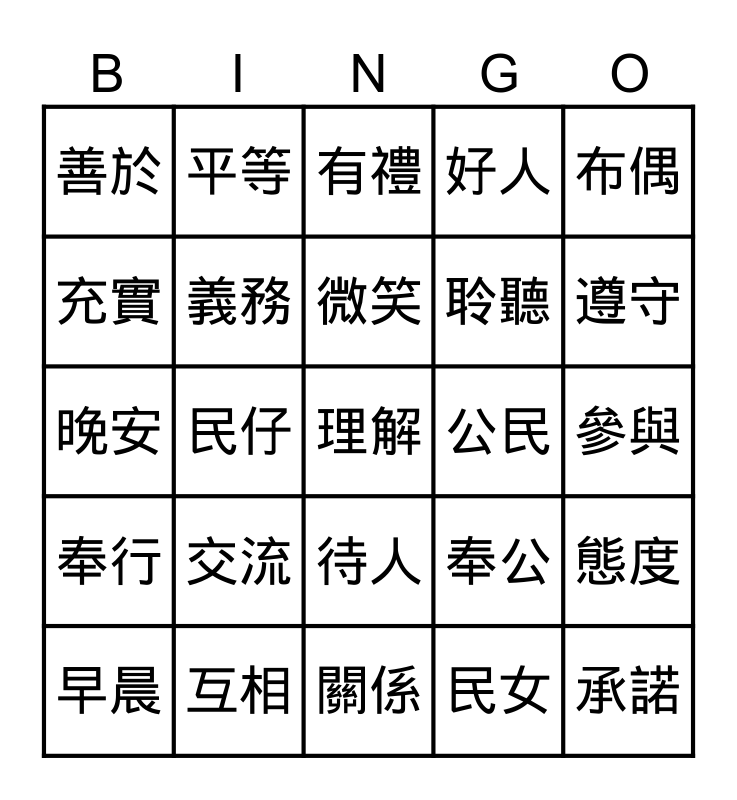 This bingo card has 50 words: 為己, 理解, 規則, 關係, 交流, 關心, 平等, 接納, 充實, 清潔, 義務, 好人, 態度, 奉公, 守法, 融入, 微笑, 公民, 教育, 布偶, 民仔, 民女, 善於, 聆聽, 信守, 承諾, 遵守, 秩序, 有禮, 待人, 承擔, 責任, 尊重, 生命, 互相, 樂於, 助人, 愛護, 環境, 參與, 社區, 你好, 請教, 多謝, 早晨, 晚安, 唔該, 生活, 奉行 and 為人.