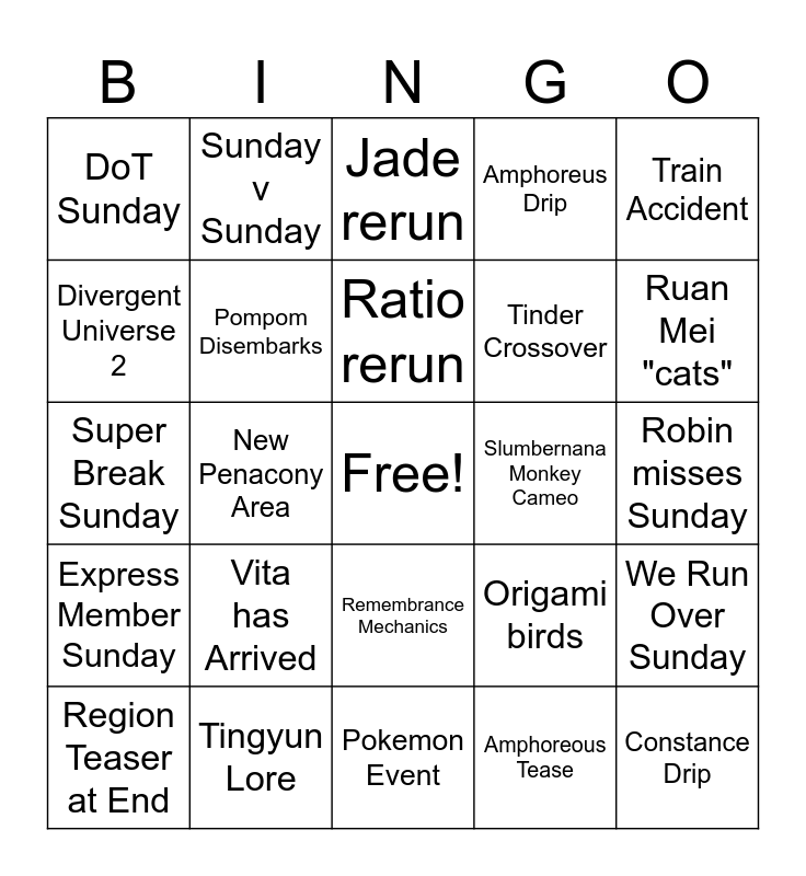 This bingo card has a free space and 32 words: Amphoreous Tease, Bully Owlbert, New Penacony Area, Stellaron Hunter Sunday, Express Member Sunday, Pompom Disembarks, Train Accident, We Run Over Sunday, Sunday v Sunday, Free 5 Star, Ratio rerun, Jade rerun, Firefly rerun, Boothill rerun, Slumbernana Monkey Cameo, Trashcan Joke, Region Teaser at End, Super Break Sunday, Remembrance Mechanics, Vita has Arrived, Origami birds, Robin in stream, Robin misses Sunday, Tingyun Lore, Constance Drip, Amphoreus Drip, Tinder Crossover, Divergent Universe 2, DoT Sunday, Pokemon Event, The Herta does tax evasion and Ruan Mei "cats".