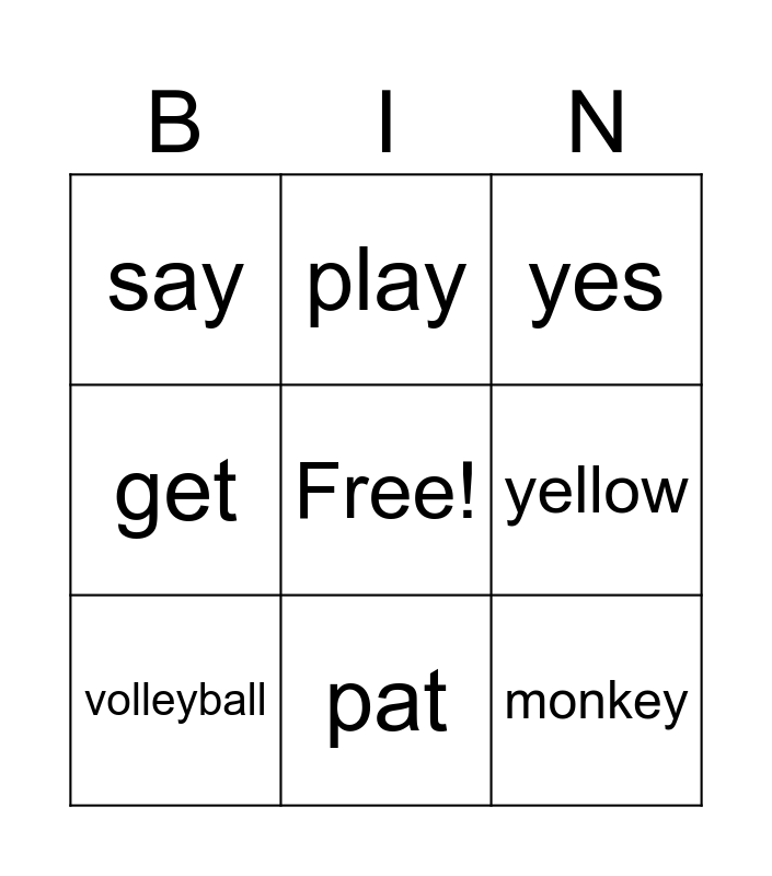 This bingo card has a free space and 8 words: yellow, yes, play, volleyball, say, monkey, get and pat.