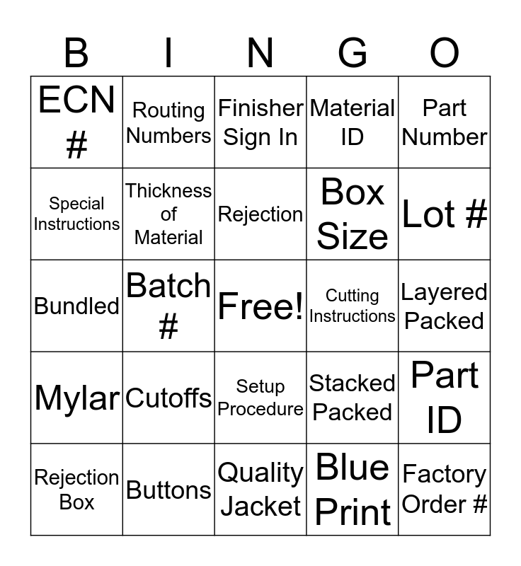 This bingo card has a free space and 24 words: Cutoffs, Buttons, Rejection, Rejection Box, Part Number, ECN #, Special Instructions, Routing Numbers, Cutting Instructions, Setup Procedure, Box Size, Bundled, Stacked Packed, Part ID, Thickness of Material, Blue Print, Layered Packed, Finisher Sign In, Lot #, Batch #, Factory Order #, Mylar, Material ID and Quality Jacket.