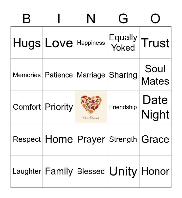 This bingo card has a free space and 24 words: Home, Family, Marriage, Laughter, Trust, Hugs, Memories, Love, Friendship, Prayer, Sharing, Comfort, Strength, Grace, Patience, Unity, Date Night, Happiness, Soul Mates, Priority, Honor, Respect, Equally Yoked and Blessed.