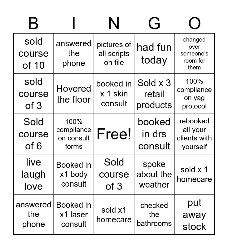 This bingo card has a free space and 24 words: Booked in x1 body consult, Booked in x1 laser consult, booked in x 1 skin consult, answered the phone, changed over someone's room for them, sold course of 10, sold course of 3, answered the phone, booked in drs consult, Sold course of 3, Sold x 3 retail products, Sold course of 6, spoke about the weather, sold x 1 homecare, Hovered the floor, checked the bathrooms, rebooked all your clients with yourself, pictures of all scripts on file, 100% compliance on yag protocol, 100% compliance on consult forms, put away stock, live laugh love, had fun today and sold x1 homecare.