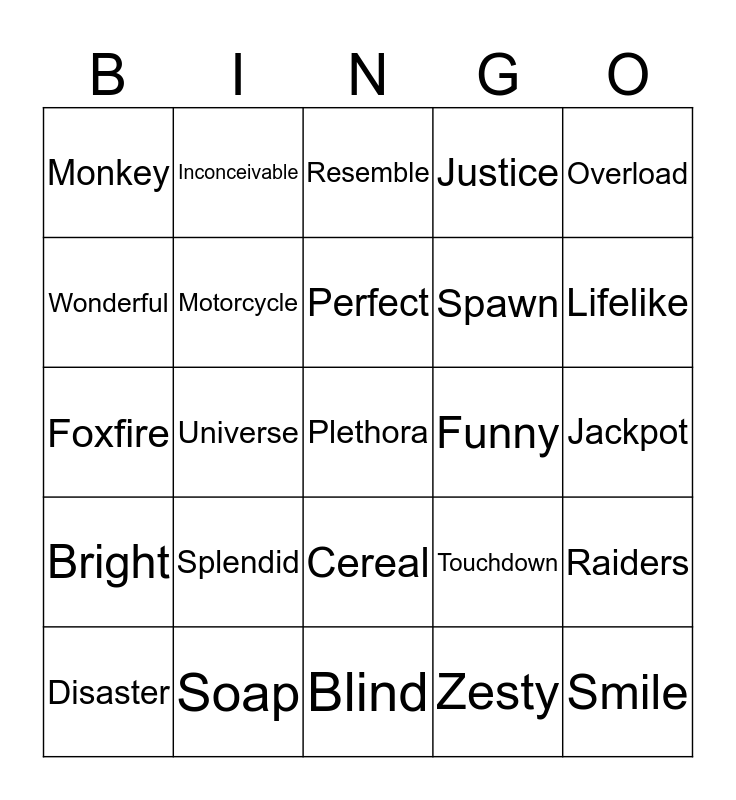 This bingo card has 25 words: Splendid, Blind, Perfect, Disaster, Overload, Monkey, Wonderful, Inconceivable, Funny, Cereal, Spawn, Foxfire, Touchdown, Raiders, Motorcycle, Smile, Jackpot, Resemble, Lifelike, Universe, Plethora, Soap, Bright, Justice and Zesty.