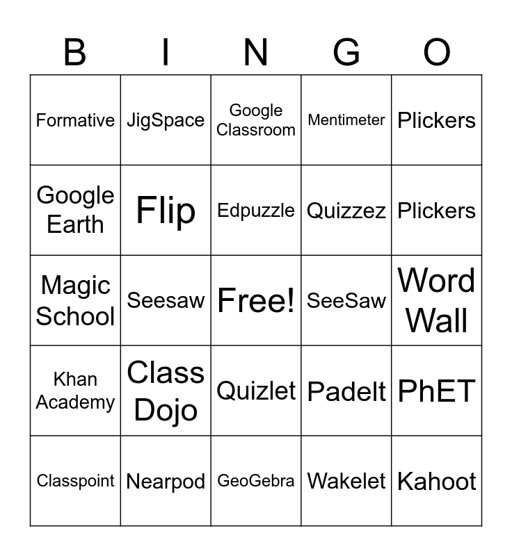 This bingo card has a free space and 25 words: Class Dojo, GeoGebra, Edpuzzle, Classpoint, Plickers, Formative, Google Earth, JigSpace, SeeSaw, Quizlet, Quizzez, Magic School, Padelt, PhET, Flip, Book Creator, Word Wall, Google Classroom, Plickers, Seesaw, Kahoot, Nearpod, Khan Academy, Mentimeter and Wakelet.