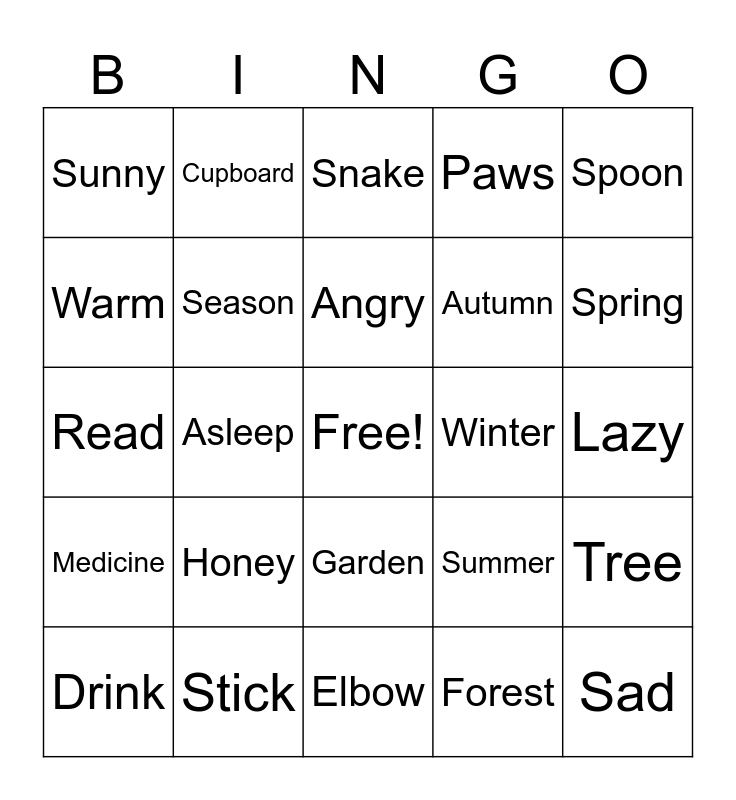 This bingo card has a free space and 29 words: Drink, Sting, Asleep, Flour, Sunny, Snake, Season, Honey, Winter, Stick, Lazy, Sad, Elbow, Forest, Spring, Strong, Garden, Medicine, Spoon, Read, Summer, Beehive, Autumn, Warm, Paws, Cupboard, Tree, Angry and Strange.