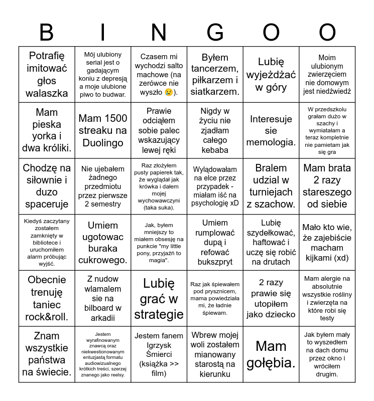 This bingo card has 54 words: 10lat trenowałam koszykówkę, Wylądowałam na elce przez przypadek - miałam iść na psychologię xD, Jak piwo to tylko Corona!!, Z nudow wlamalem sie na bilboard w arkadii, Mam brata 2 razy stareszego od siebie, Jak byłem mały to wyszedłem na dach domu przez okno i wróciłem drugim., Byłem tancerzem, piłkarzem i siatkarzem., Przeczytałam całą serię Harry’ego Pottera minimum 3 razy, Moim ulubionym zwierzęciem nie domowym jest niedźwiedź, Moim zwierzęciem duchowym jest szop, Potrafię imitować głos walaszka, Wbrew mojej woli zostałem mianowany starostą na kierunku, Umiem rumplować dupą i refować bukszpryt, Jak, byłem mniejszy to miałem obsesję na punkcie "my little pony, przyjaźń to magia"., Kiedyś panicznie bałem się psów., Lubię szydełkować, haftować i uczę się robić na drutach, Chodzę na siłownie i duzo spaceruje, Prawie odciąłem sobie palec wskazujący lewej ręki, Uwielbiam wszystko zrobione z grejfruta., Raz złożyłem pusty papierek tak, że wyglądał jak krówka i dałem mojej wychowawczyni (taka suka)., Kiedyś zaczytany zostałem zamknięty w bibliotece i uruchomiłem alarm próbując wyjść., Lubię grać w strategie, Nie ujebałem żadnego przedmiotu przez pierwsze 2 semestry, Lubię wyjeżdżać w góry, Lubię rzucać fun factami na najbardziej losowe tematy., Mój ulubiony serial jest o gadającym koniu z depresją a moje ulubione piwo to budwar., Znam wszystkie państwa na świecie., Potrafię zagrać muzykę z minecrafta na gitarze., Raz jak śpiewałem pod prysznicem, mama powiedziała mi, że ładnie śpiewam., Mało kto wie, że zajebiście macham kijkami (xd), Jestem wychowawcą na obozach żeglarskich (tak wiem, biedne dzieci), Jestem fanem Igrzysk Śmierci (książka >> film), Mój kot waży prawie 9 kilo i ma bulimię 😔💔, Studiuję to co studiuję, żeby być bogata i mieszkać w Hiszpanii., Czasem mi wychodzi salto machowe (na zerówce nie wyszło 😢)., Mam gołębia., Interesuje sie memologia., Umiem ugotowac buraka cukrowego., Obecnie trenuję taniec rock&roll., Mam pieska yorka i dwa króliki., Od dziecka jestem kibicem piłki ręcznej., Mam astmę xd, Nie lubię arbuza., W swoim życiu trenowałam pływanie i taniec., Bralem udzial w turniejach z szachow., Bylem tylko w jednym kraju za granica., Jestem wyrafinowanym znawcą oraz niekwestionowanym entuzjastą formatu audiowizualnego krótkich treści, szerzej znanego jako reelsy., 2 razy prawie się utopiłem jako dziecko, Mam 1500 streaku na Duolingo, W przedszkolu grałam dużo w szachy i wymiatałam a teraz kompletnie nie pamietam jak się gra, Nigdy w życiu nie zjadłam całego kebaba, Chodziłam kiedyś 3 dni ze złamaną ręką bo trenerka myślała, że symuluje, Mam alergie na absolutnie wszystkie rośliny i zwierzęta na które robi się testy and Uczyłam się francuskiego 10 lat i dalej absolutnie nie umiem tego języka.