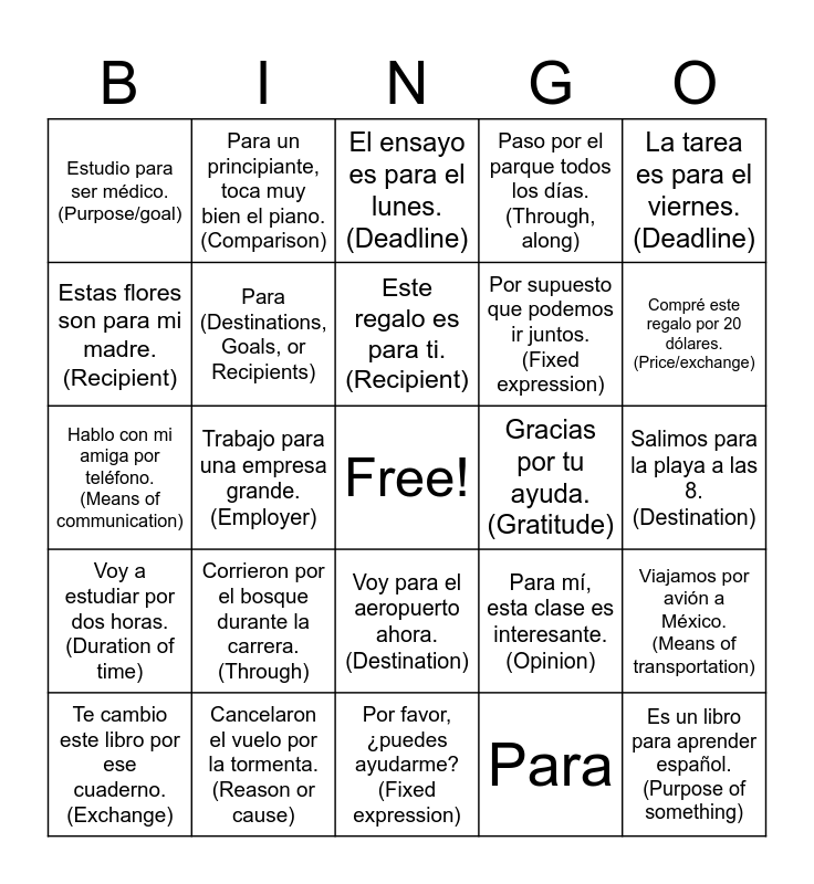 This bingo card has a free space and 28 words: Viajamos por avión a México. (Means of transportation), Lo hizo por amor. (Reason/motivation), Por supuesto que podemos ir juntos. (Fixed expression), Para, Estas flores son para mi madre. (Recipient), El ensayo es para el lunes. (Deadline), Para un principiante, toca muy bien el piano. (Comparison), Voy a estudiar por dos horas. (Duration of time), Gracias por tu ayuda. (Gratitude), Te cambio este libro por ese cuaderno. (Exchange), Hablo con mi amiga por teléfono. (Means of communication), Paso por el parque todos los días. (Through, along), Cancelaron el vuelo por la tormenta. (Reason or cause), Por favor, ¿puedes ayudarme? (Fixed expression), Compré este regalo por 20 dólares. (Price/exchange), Salimos tarde por el tráfico. (Reason), Corrieron por el bosque durante la carrera. (Through), Para (Destinations, Goals, or Recipients), Este regalo es para ti. (Recipient), Voy para el aeropuerto ahora. (Destination), Estudio para ser médico. (Purpose/goal), Necesito esto para mañana. (Deadline), Es un libro para aprender español. (Purpose of something), Trabajo para una empresa grande. (Employer), Salimos para la playa a las 8. (Destination), Para mí, esta clase es interesante. (Opinion), La tarea es para el viernes. (Deadline) and Para ser tan joven, es muy sabio. (Comparison).