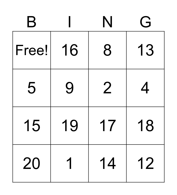 This bingo card has 21 words: 1, 10, 16, 6, 14, 2, Free!, 8, 17, 4, 15, 13, 12, 7, 9, 3, 20, 19, 5, 18 and 11.