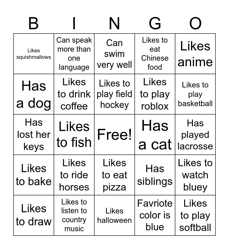 This bingo card has a free space and 24 words: Likes to ride horses, Likes to listen to country music, Likes to play field hockey, Likes to draw, Likes anime, Likes squishmallows, Has a dog, Can speak more than one language, Has a cat, Likes to eat pizza, Likes to play roblox, Has lost her keys, Has siblings, Likes to watch bluey, Likes to drink coffee, Favriote color is blue, Has played lacrosse, Can swim very well, Likes to play basketball, Likes to fish, Likes to play softball, Likes to bake, Likes to eat Chinese food and Likes halloween.